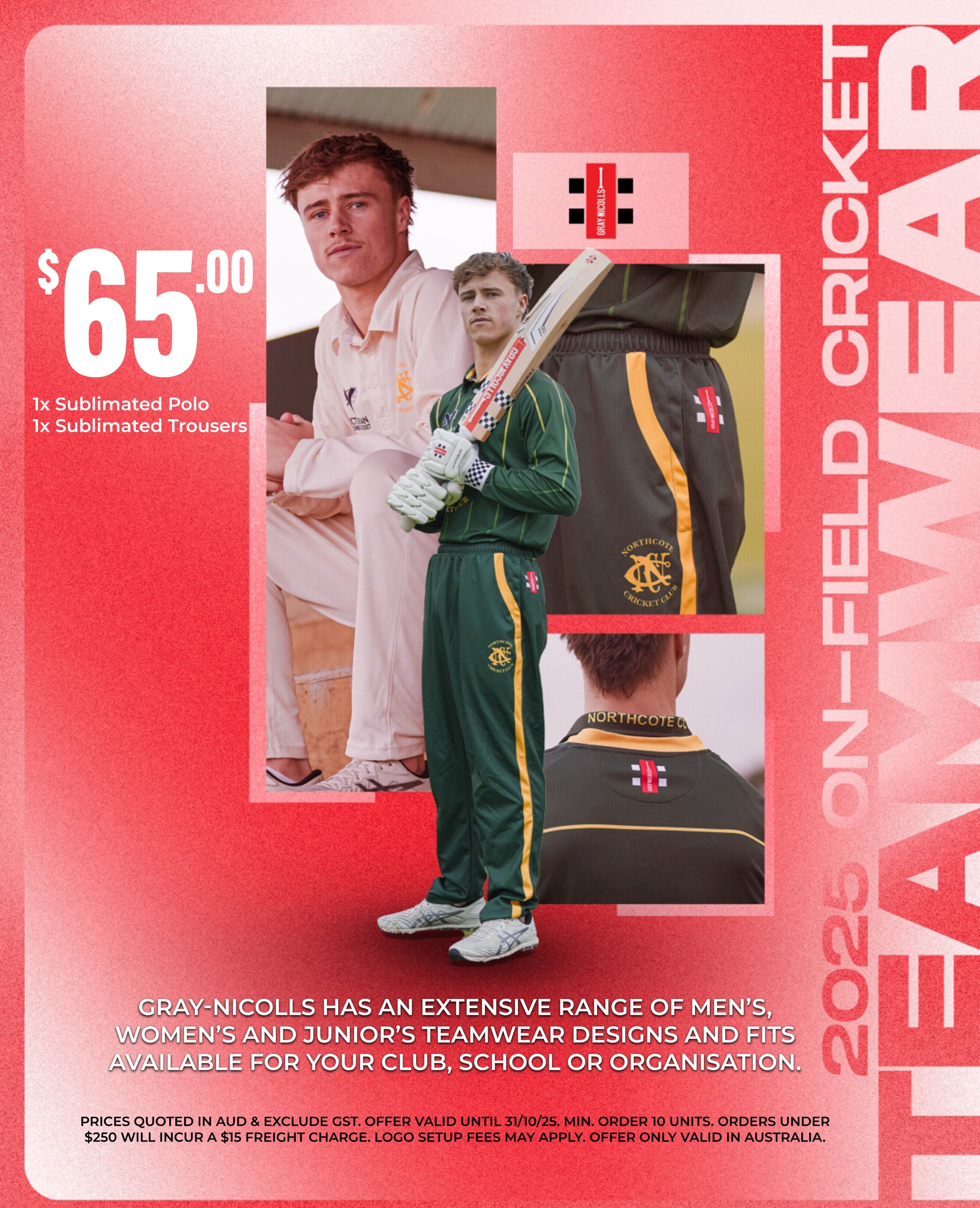 Born 150 years ago, built for today – cricket apparel that blends tradition with performance. From international teams, to local clubs, Gray-Nicolls Teamwear is trusted around Australia, New Zealand & the globe. Upgrade to cricket's iconic brand by clicking the button below or creating your own dream apparel on our Custom Kit Builder.